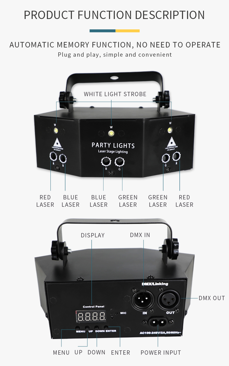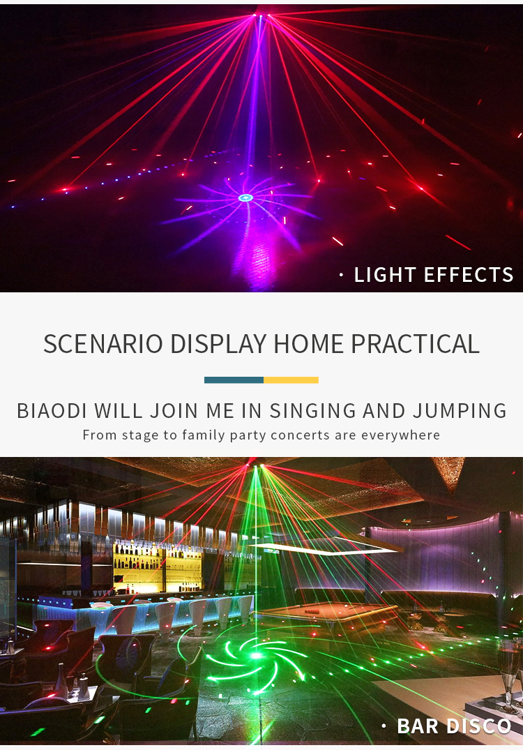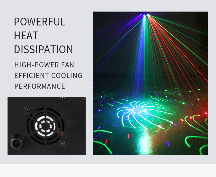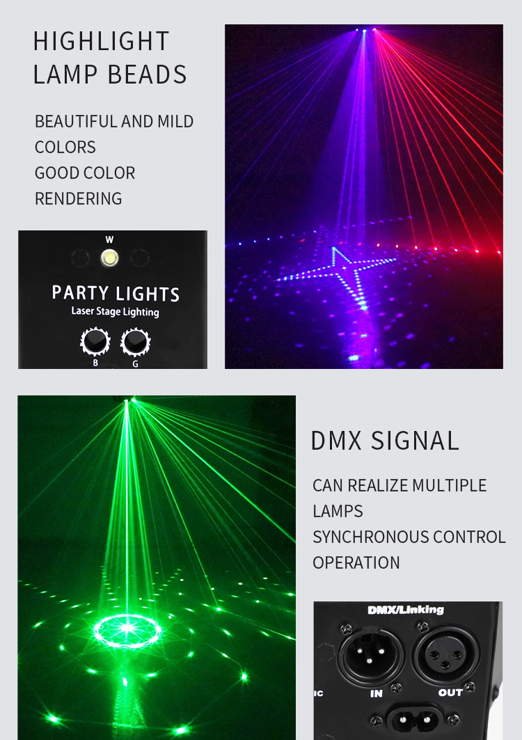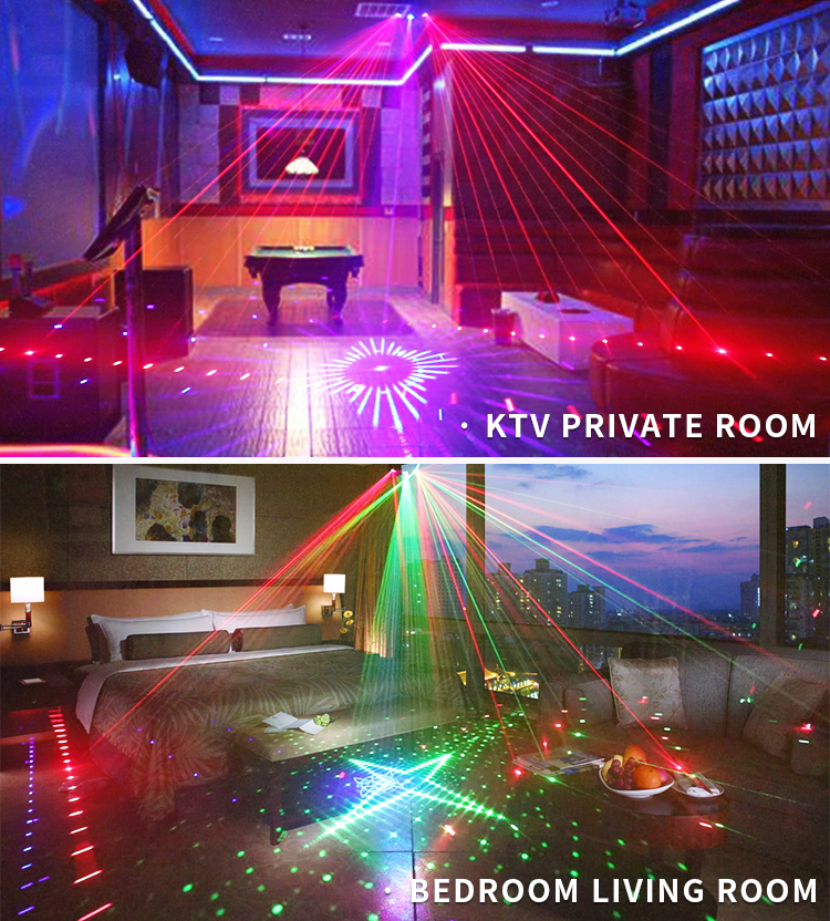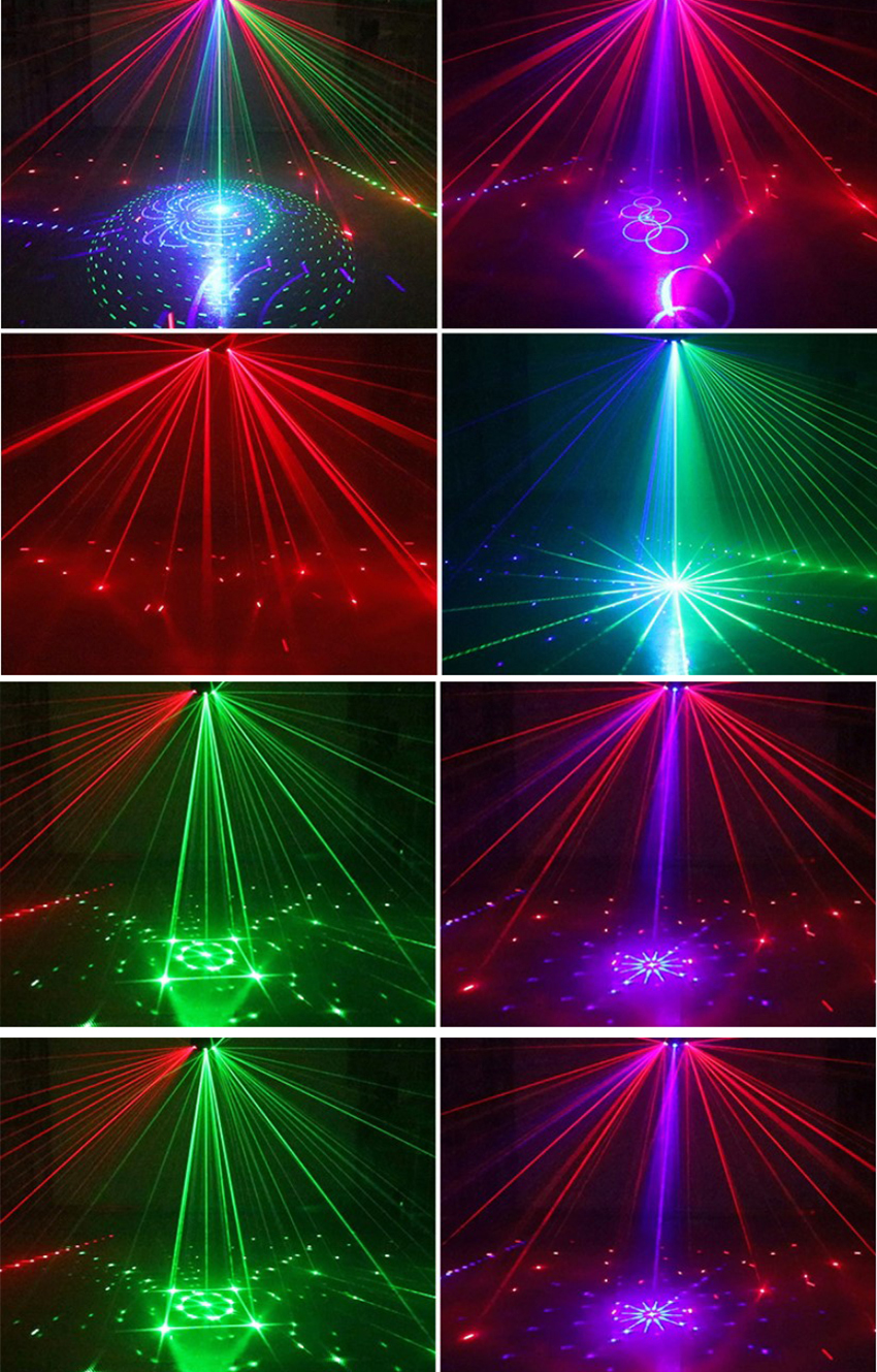 (1) Built-in many kinds of nice amazing effects (Laser Beam , white Strobe Lights , Laser Patterns)